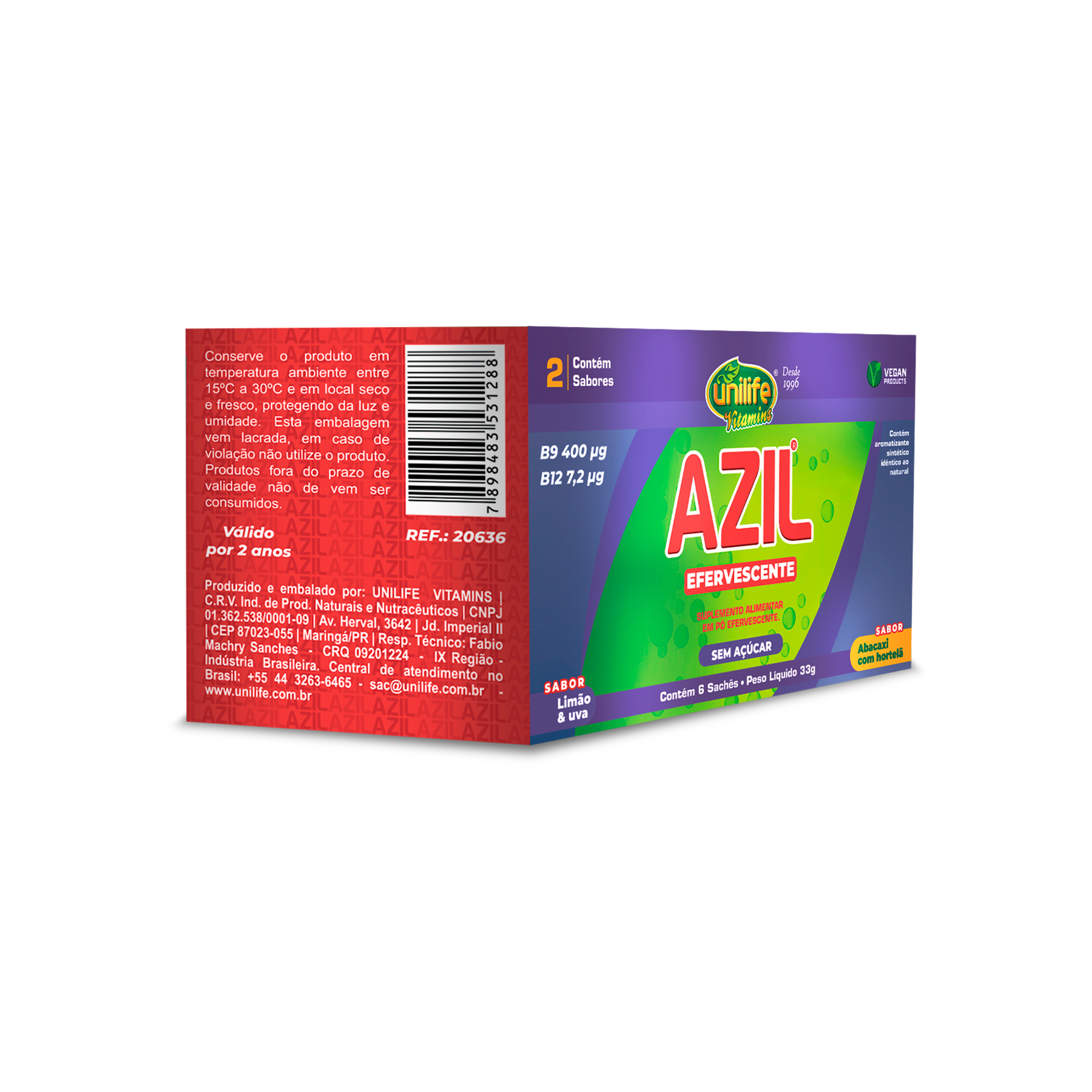 INGREDIENTES: O Azil sachê (sabor limão com uva): Polpa de limão, maltodextrina, polpa de uva, ácido fólico, metilcobalamina, reguladores de acidez bicarbonato de sódio e ácido cítrico, bicabornato de sódio, aroma idêntico ao natural de limão, antiumectante carbonato de silício e fosfato tricálcio, e edulcorante sucralose, glicosídeos de esteviol e taumatina.
