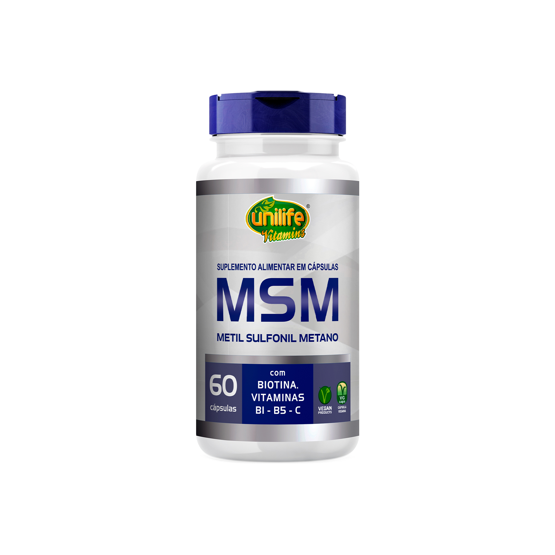 INGREDIENTES: Metilsulfonilmetano (MSM), ácido acsórbico, D-pantotenato de cálcio, cloridrato de tiamina, D-biotina, excipiente celulose microcristalina e antiumectante estearato de magnésio. Cápsula: gelatina vegetal, água purificada e corante dióxido de titânio