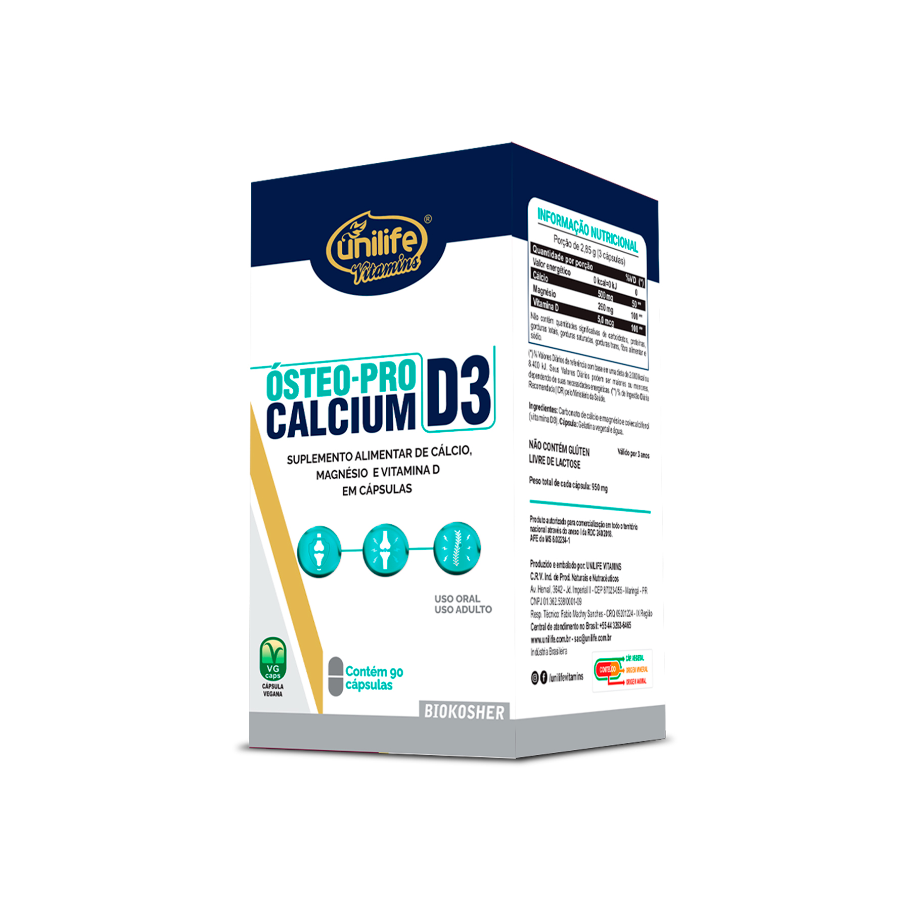 É um suplemento BIOKOSHER, desenvolvido a partir de carbonato de cálcio e magnésio, com adição de vitamina D3 (colecalciferol). Sem lactose e glúten.